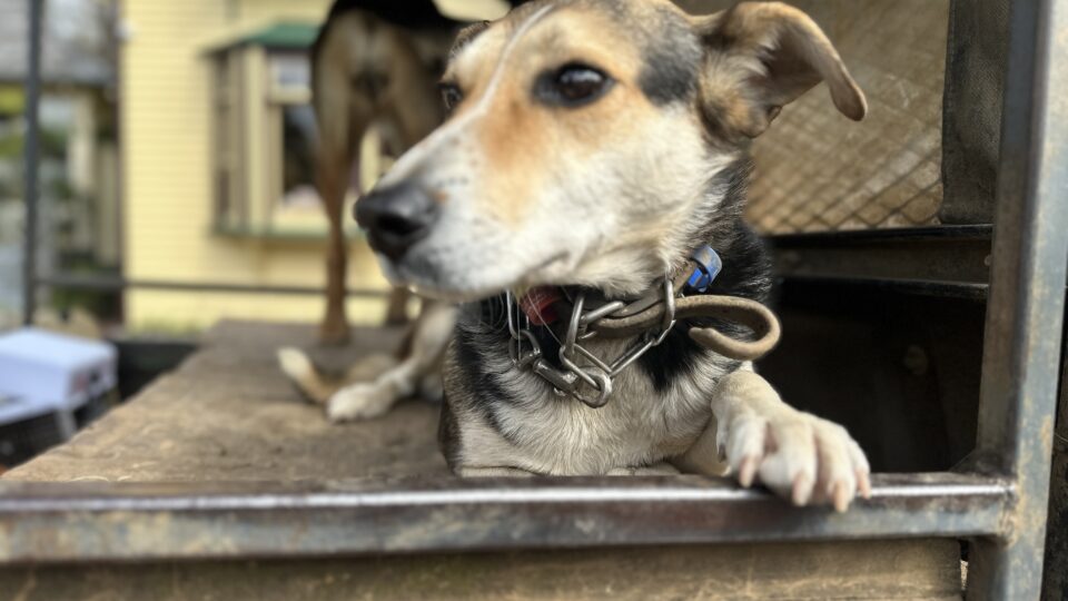 This five year old heading dogloves to work, is very driven and our farmers think she prefers being around livestock than people! She enjoys the wind in her ears as she rides on the back of our RTV – four-wheeler farm vehicle or our UBCO – electric bike.